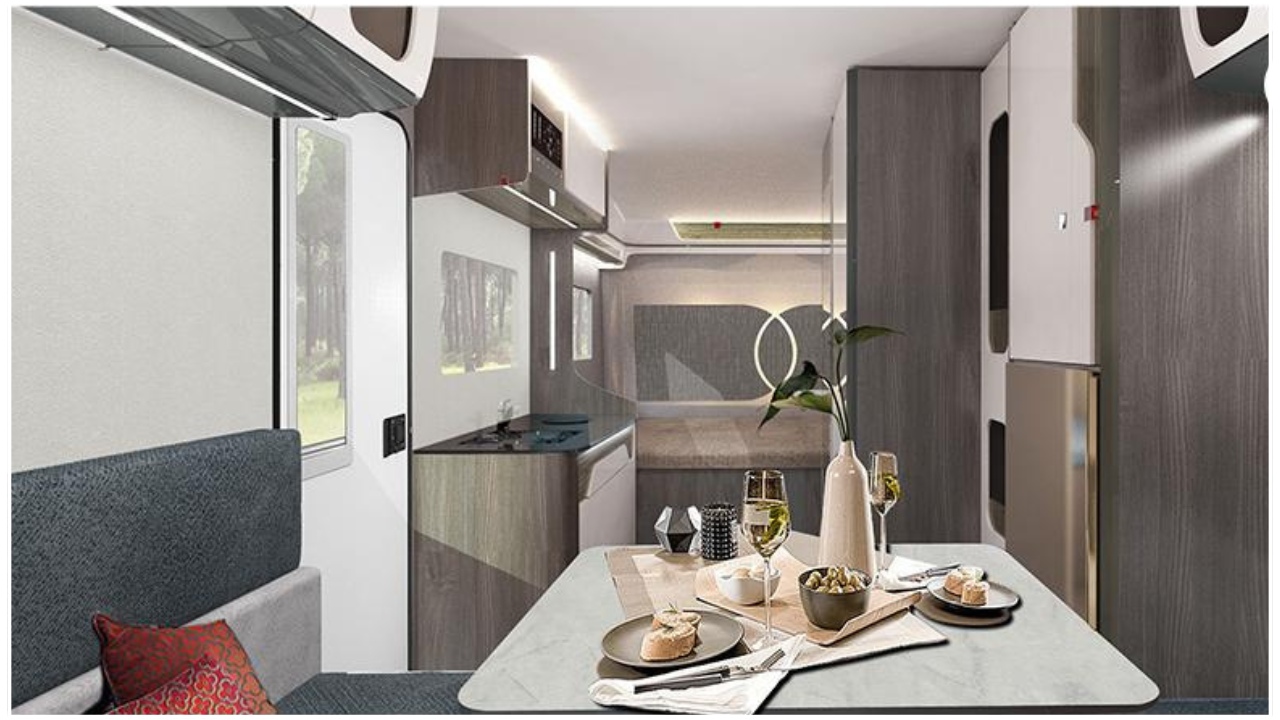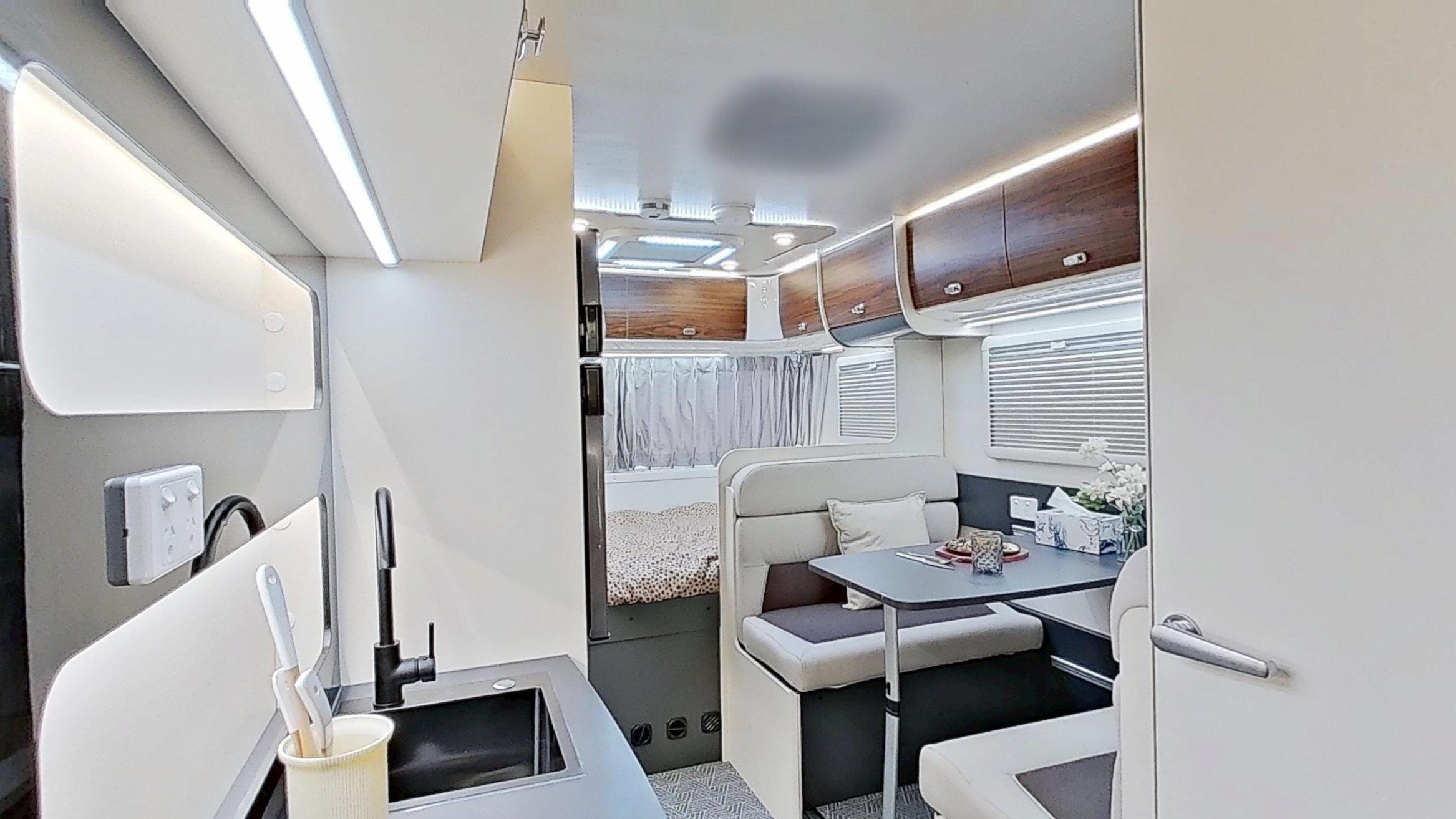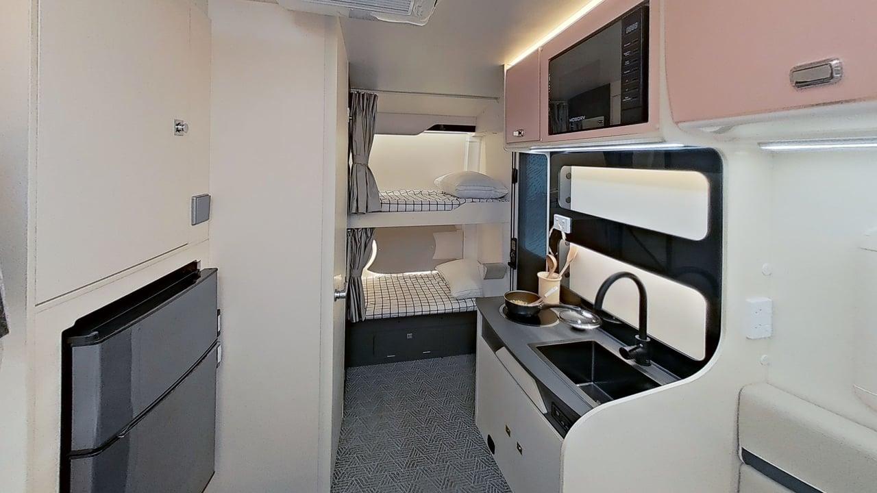Designed to maximize space, the Cubby’s kitchen offers all the essentials without compromise. The large countertop, stainless steel sink, and electric cooktop are cleverly arranged to provide a full cooking experience. With the integrated 118L fridge and 20L microwave, you have everything you need in one compact, efficient space, making your travels both comfortable and convenient.