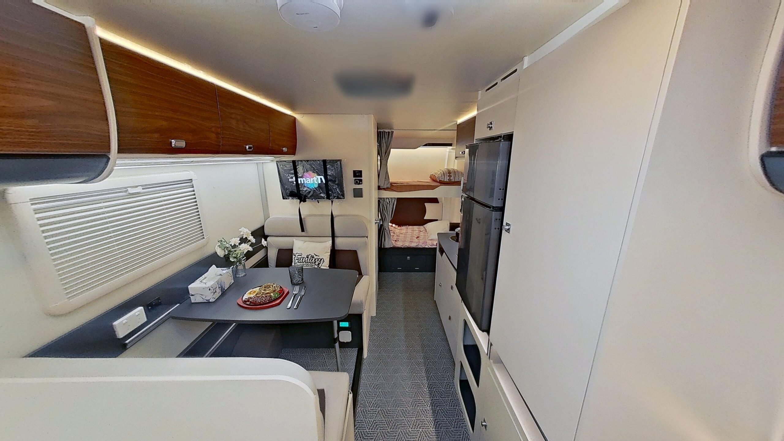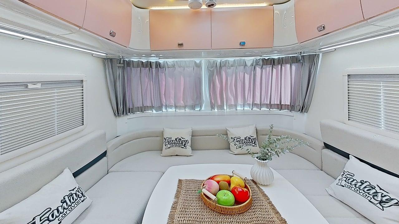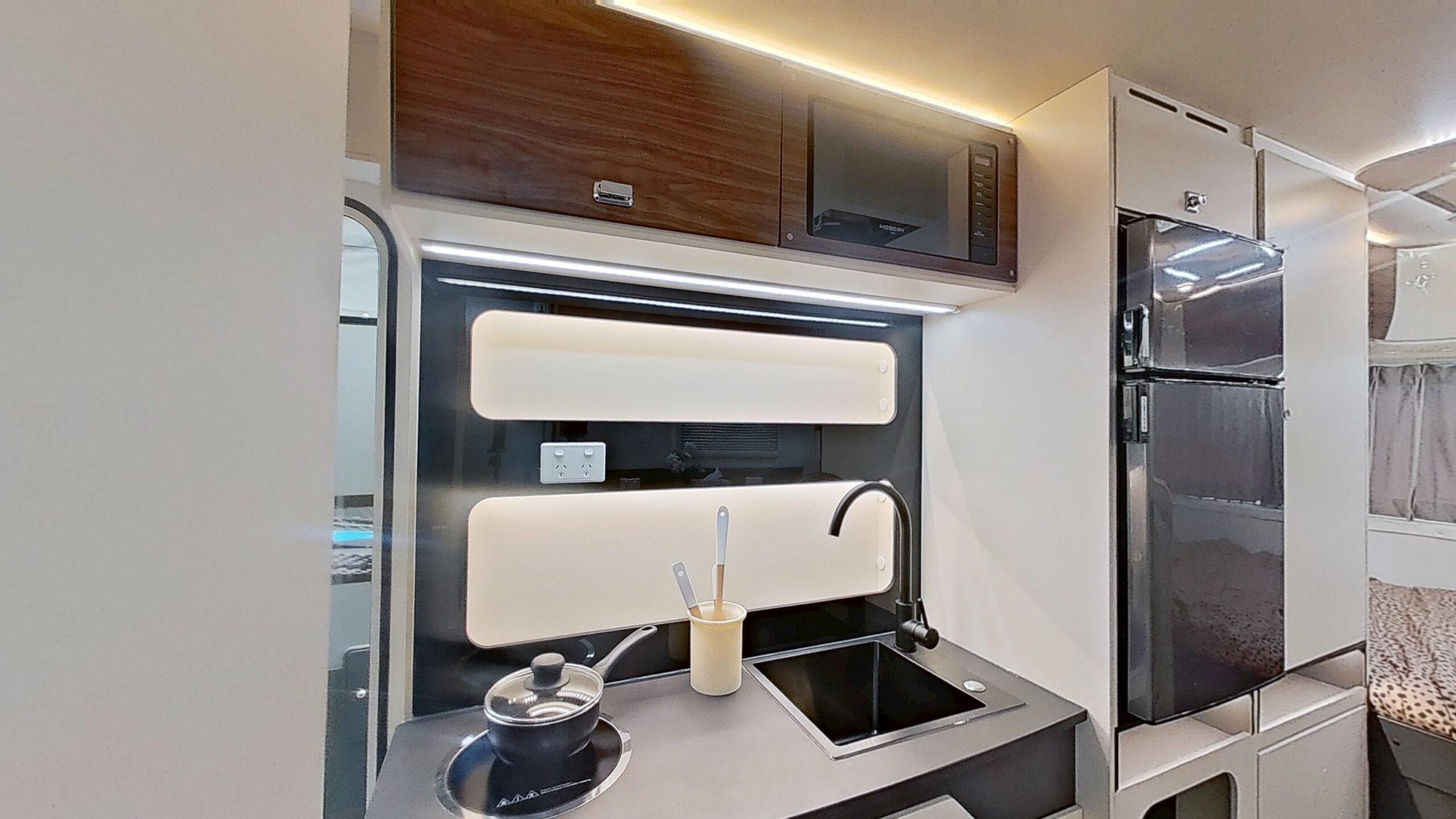 Designed to maximize space, the Cubby’s kitchen offers all the essentials without compromise. The large countertop, stainless steel sink, and electric cooktop are cleverly arranged to provide a full cooking experience. With the integrated 118L fridge and 20L microwave, you have everything you need in one compact, efficient space, making your travels both comfortable and convenient.