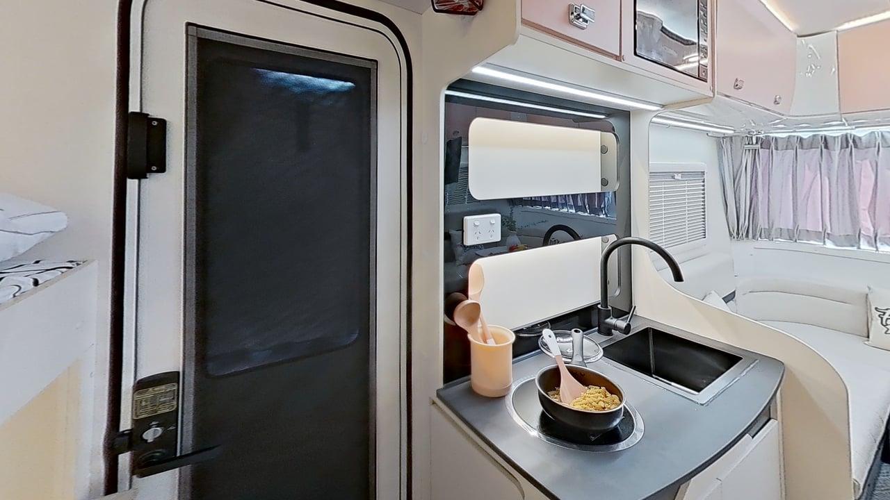 With a large countertop, stainless steel sink, and electric cooktop, Cubby’s kitchen offers everything you need for a comfortable camping experience.